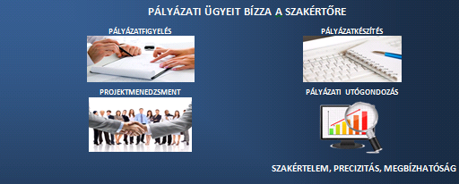 Vállalkozásunk az Európai Uniós, hazai, és egyéb nemzetközi pályázatok figyelésével, készítésével, teljes körű projektmenedzsmentjével, projektek szervezésével, megvalósíthatósági tanulmányok valamint üzleti- pénzügyi- likviditási tervek készítésével, és üzletviteli szolgáltatás nyújtásával foglalkozik.